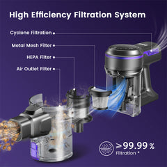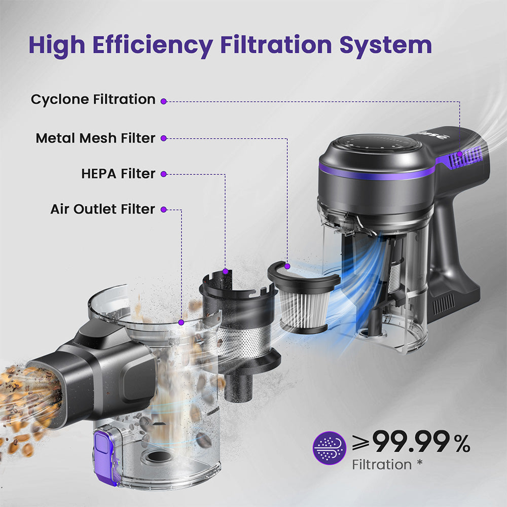 Daugiasluoksnė cikloninė filtravimo sistema su nerūdijančio plieno tinkleliu, HEPA H13 filtru ir galutiniu kempininiu filtru pašalina 99,99 % dalelių, net iki 0,3 mikrono dydžio, užtikrindama švaresnį orą jūsų namuose. Idealu alergiškiems asmenims ir gyvūnų augintojams.