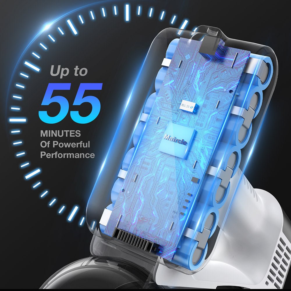 Įrengtas 7 × 2600 mAh talpos akumuliatorių paketu, MOOSOO belaidis dulkių siurblys veikia iki 55 minučių standartiniu režimu, todėl galite išvalyti visus namus (iki 180 m²) vienu įkrovimu.